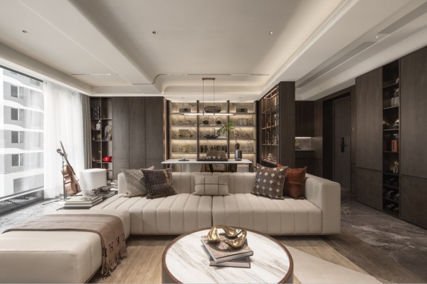 建面约143㎡大平层,整体空间呈现经典灰棕配色,精致而典雅,同时利用精美的线条与装饰元素,彰显庄重大方。开放式宽厅格局营造无界交互生活聚场,散发奢华气息;米白色皮质沙发搭配黑色大理石茶几,鲜明色调对比,时尚而隽永,高贵而神秘,独特的气质,诠释绅士特有的态度。